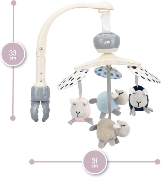 Soothe your baby with gentle movement and melodies. The MoMi KIKI musical mobile with a universal mount attaches easily to a crib, stroller, or car seat. It offers 6 calming melodies including white noise, slow rotation, and soft sensory toys in muted colors that can be removed and washed.