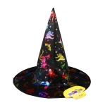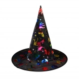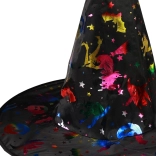 Get ready for Halloween or themed parties with this wizard hat. The hat is black with holographic patterns featuring bats and stars, ideal for anyone looking to stand out.