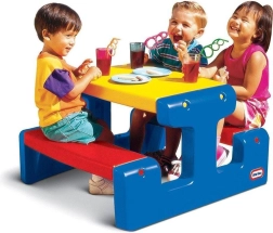 The LITTLE TIKES Jr kids’ picnic table with benches offers a practical and stylish solution for outdoor fun. Thanks to its compact size, it fits on a balcony, patio, or smaller garden while still providing space for up to four children. The durable material withstands everyday use and the elements, while the easy-to-clean surface ensures quick maintenance.