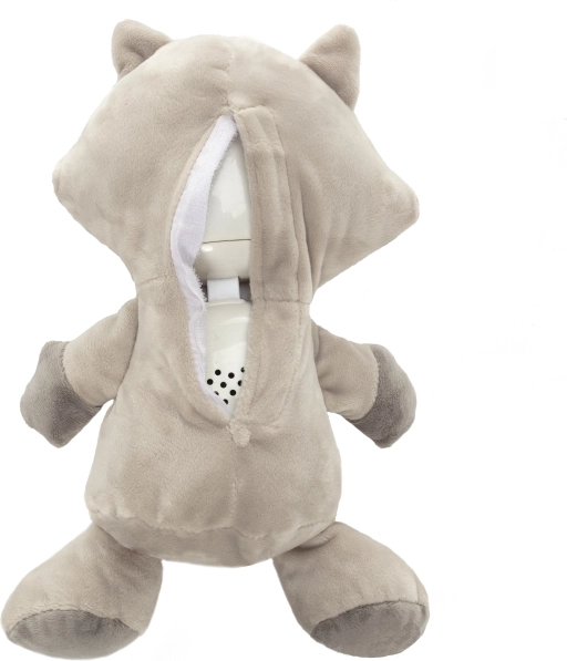 The battery-operated device is safely stored on the raccoon's back, protected by a zip. This sleep companion creates a sense of security and a regular sleep routine for children.