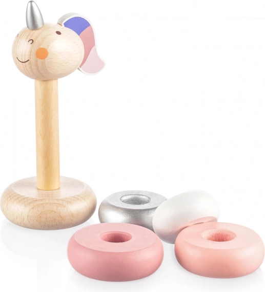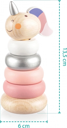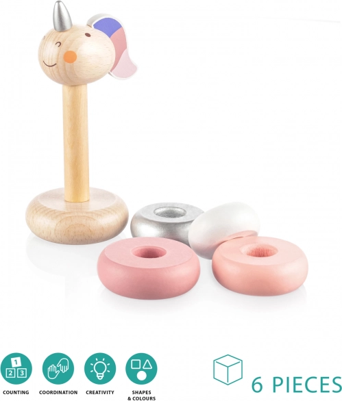 Experience playful educational fun with the wooden stacking toy Unicorn, designed for children from 16 months. This playful set allows children to stack and place rings made of quality beech wood, developing their fine motor skills and spatial reasoning.