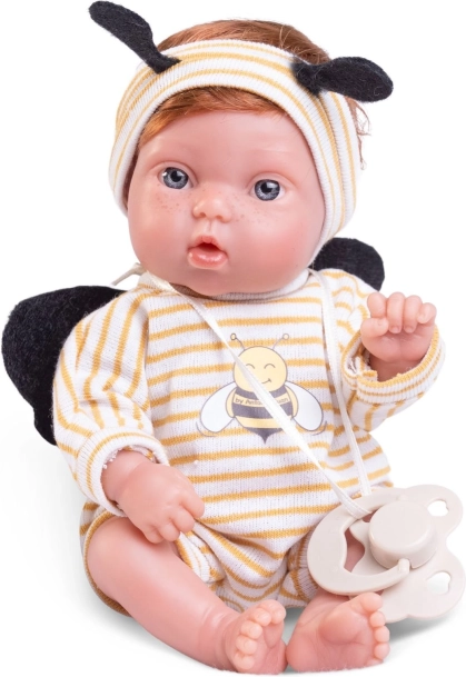 The doll is dressed in a bee outfit with antennas and a functional pacifier that captures children's attention.