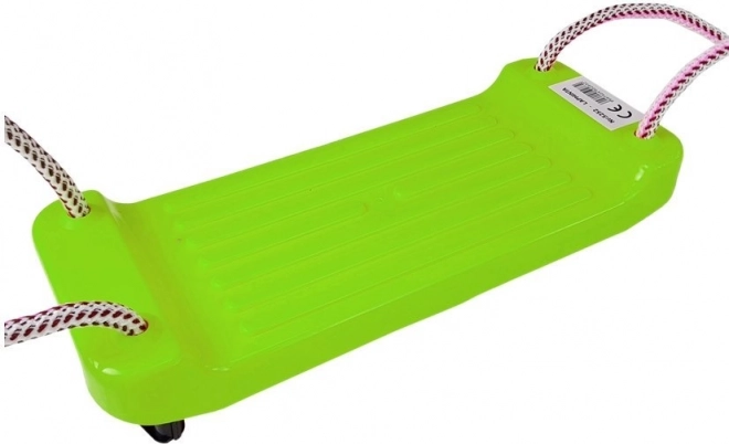 Green plastic board swing for children from 3 years old provides hours of movement and fun at home or in the garden. It has sturdy ropes with fittings, easy assembly, is lightweight and durable, and meets CE and EN 71 certifications. Maximum load 50 kg.