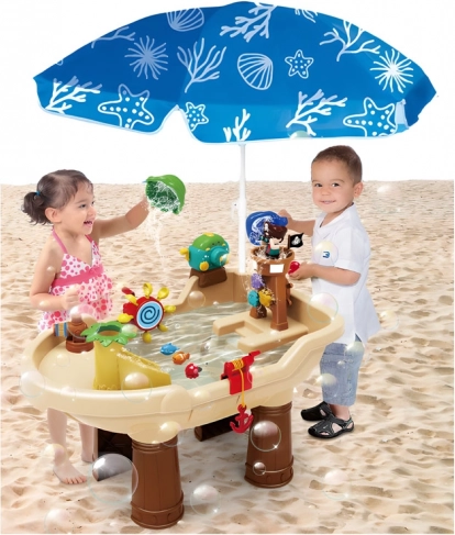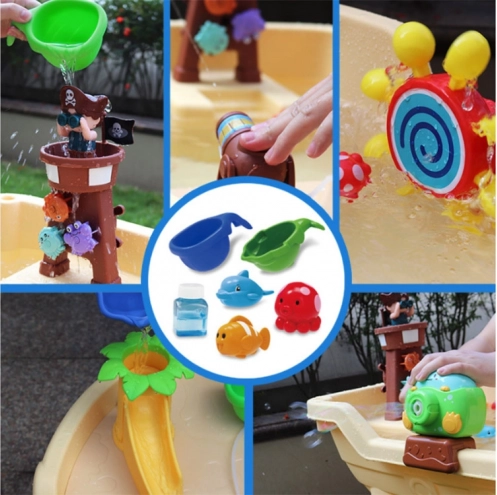 Discover backyard adventures with this pirate-themed water table – a creative toy for kids that combines a sandbox, water play, and a bubble machine. With a water cannon, spinning wheels, and twirling animals, it develops fine motor skills, sensory perception, and imagination. A durable plastic build, safe rounded edges, and the option to play outdoors or indoors guarantee year-round fun.