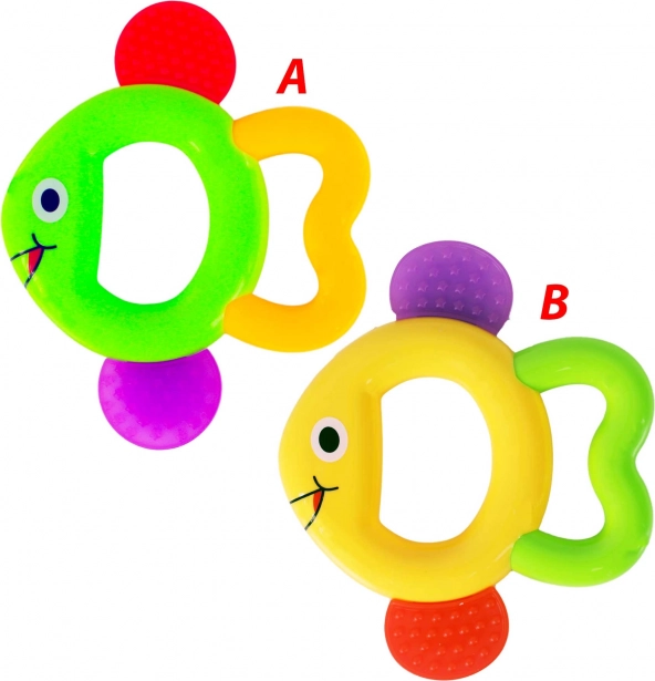 Cheerful fish-shaped rattle and teether for little ones. Supports motor skills, vision, and teething relief. Lightweight, easy-to-hold design.