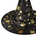 The black base with shimmering golden stars immediately draws attention and complements any Halloween or carnival costume.