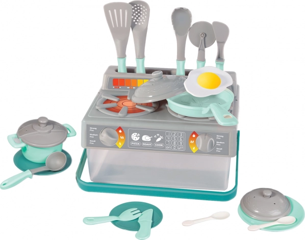 This children's kitchen set in grey and turquoise color contains everything children need for playing cook. The set includes: