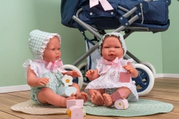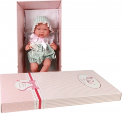 Pablo is dressed in a stylish green-and-white sleeveless summer romper with short legs, decorated with white lace, and complemented by a tie-on bonnet. He lies on a soft pillow with a blanket and has a pacifier on a chain that can be placed in his mouth, where it holds firmly. The manufacturer ASI (Asivil) is a family-owned Spanish brand with more than 50 years of tradition, committed to 100% local artisanal production and strict European standards.