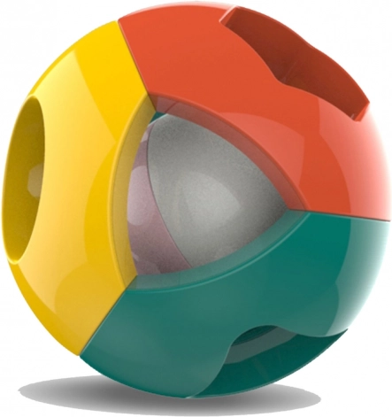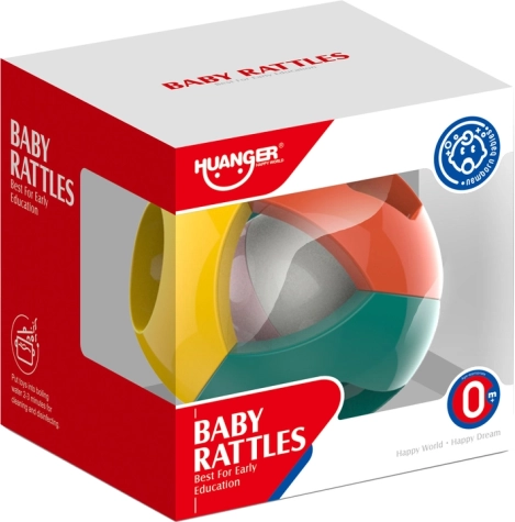 A cheerful rattle ball for the littlest ones that supports the development of senses, grasp, and hand–eye coordination. Lightweight, easy to hold, and safe thanks to its rounded edges. Inside is a small bead that rattles pleasantly as it moves, and on the sides are openings in the shape of geometric figures for fun discovery. Suitable from 0 months, with CE certification and compliant with EN 71.