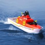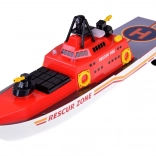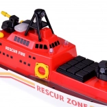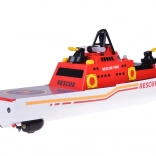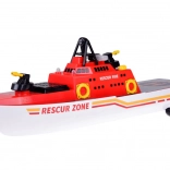 Combination of red, white, and yellow colors along with details such as water cannons and antennas contribute to an authentic rescue boat look.