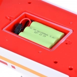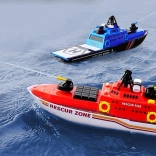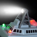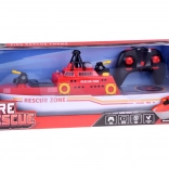 The rescue boat is also equipped with lights, making it ideal for play at dusk. This set includes the boat, remote control, charger, and rechargeable battery. The toy is made of durable plastic for lasting playtime enjoyment.