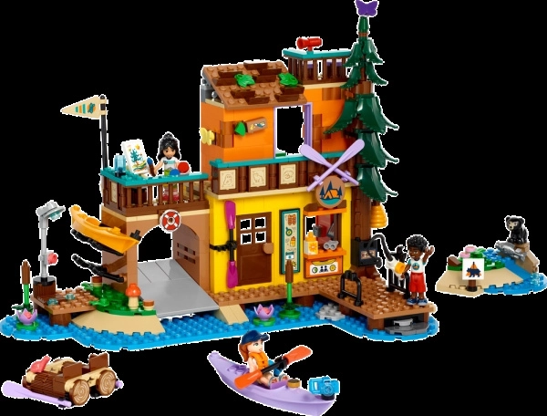 The set is packed with accessories for creative play and storytelling: from fishing rods and flippers to trophies, table tennis, and a journal with a kayaking badge. After a day full of adventures, the crew gathers in the common area to plan their next outing — maybe building a raft or painting lakeside scenery. Also included is a cute bear figure that adds a dash of adventure to every scene.