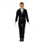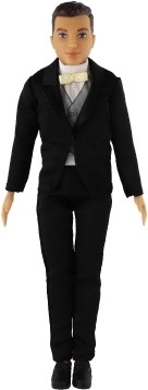 A black tuxedo with a white shirt and bow tie underscores the festive style. The groom doll is ready for the big day at the bride's side.
