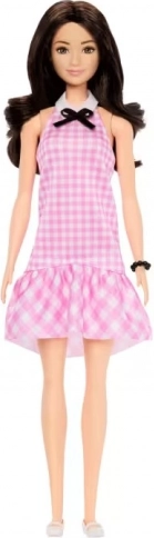 The Barbie Fashionistas doll brings a modern take on retro style inspired by the Quick Curl look from 1973. Elegant pink gingham dress with a black bow at the neckline, white shoes, and a black bracelet — together they create a chic outfit for everyday and special-occasion play.