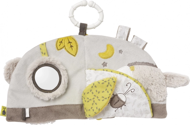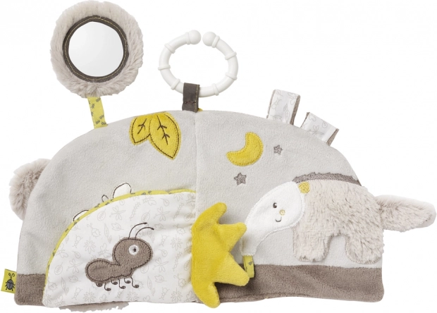 This creative plush book is ideal for stimulating and developing children's senses. Thanks to the practical loop, you can use this book not only in the stroller, but also in the crib, in the car, or wherever needed. Its attractive visual design, use of colors, and mirror will captivate curious little eyes. The varied materials and a rattle will catch little ears' attention.