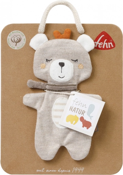 The teddy’s knitted body is made of organic cotton and contains crinkly paper inside that makes a sound when squeezed. This grasping toy playfully supports the baby’s hearing, grip and touch, and fine motor skills. Its practical size makes it easy to take the little bear everywhere.