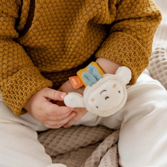 Easy to put on the little hand; when the baby moves – shaking their hands – it makes fascinating sounds that little ones love. The rattling wristband playfully supports the baby's hearing, grasp and touch, as well as fine motor skills.