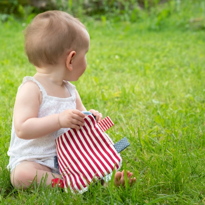 Various tactile elements and materials train a child’s hearing and touch while providing tactile stimulation.