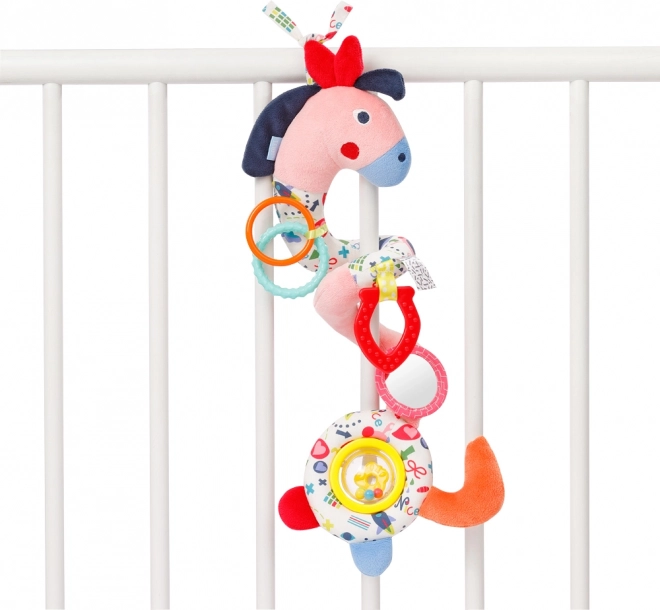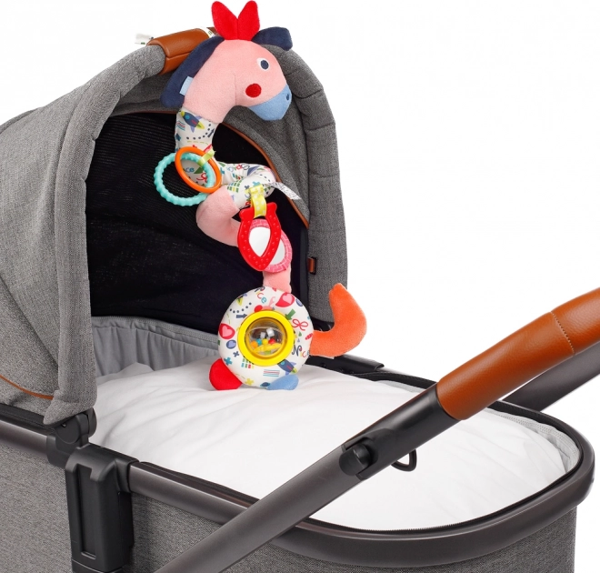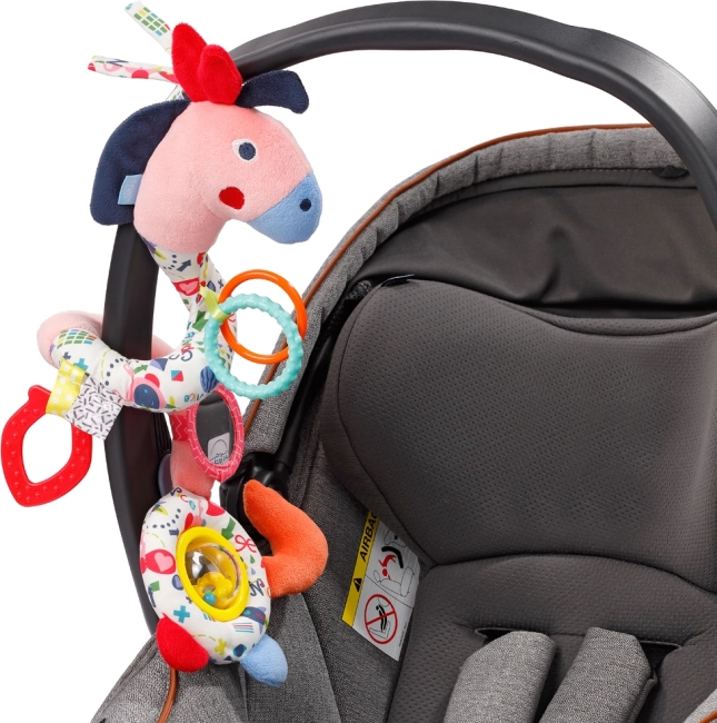 The multifunctional spiral horse from the COLOR Friends collection offers a wide range of play options at home and on the go. The stroller toy invites the child to observe, play, and grasp with its colorful combination of features and colors, making it a real eye-catcher. A hidden animal sound, crinkle paper, two grasping rings, a soft teether, a small mirror, a squeaker, and a large bead rattle help train hand-eye coordination, hearing, and touch, as well as the child’s motor skills. With two straps, the educational toy can be quickly and flexibly attached to a car seat, stroller, crib, or playpen. Every adventure becomes an exciting experience!