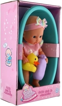 A cute baby doll in a little bathtub with a duck will delight every young bath-time fan. The set includes practical accessories for pretend bathing and care. A strong plastic body, a bathtub with a duck, and easy maintenance make this set a great gift for children ages 3 and up.