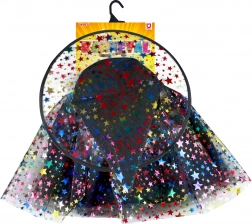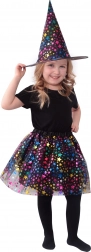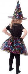 This adorable children's witch costume in black is decorated with a colorful star pattern that instantly catches the eye. It includes a fluffy tutu skirt about 30 cm long and a matching pointy hat, turning any child into a little witch in no time.