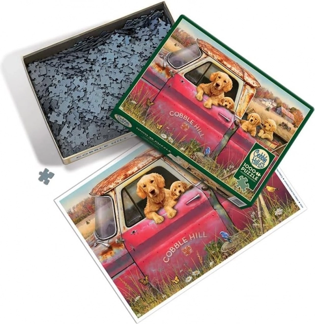 A detailed illustration of a rustic truck, flowers, and four adorable retrievers brings a warm, homey feel and joy to puzzling.