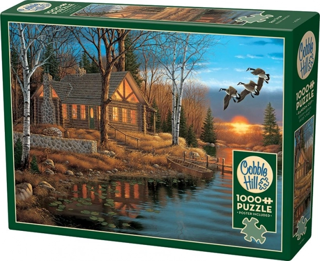 The scene of a cabin by a calm lake at sunset, with reflections on the water and birds in the sky, creates a striking image suitable for framing.