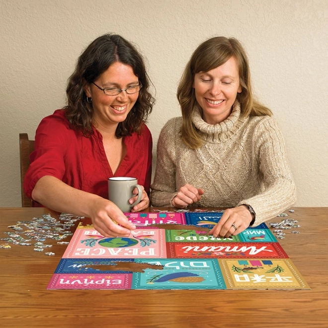 This designer puzzle brings a powerful message — peace is universal. The top row features Japanese, Hebrew, Greek, and German; in the middle you’ll find Swahili (red), Russian, Ukrainian, and other Slavic languages using Cyrillic (turquoise), Afrikaans, Dutch (green), and English. The bottom row adds Arabic, Hindi, and French.