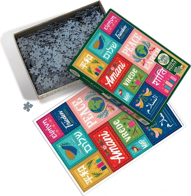 COBBLE HILL Puzzle Peace, 1000 pieces. Unique non‑grid die‑cut, higher difficulty, and poster included. A colorful tribute to peace in different languages.
