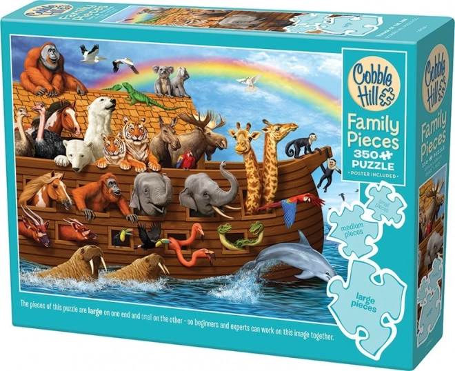 Enjoy building together with the COBBLE HILL Family Puzzle Voyage of the Ark. The box combines three piece sizes – large for the youngest, medium for a relaxed pace, and small for experienced puzzlers. Thanks to the irregular die cut, assembling is more playfully challenging, a reference poster is included, and the finished image measures approx. 67.6 × 48.9 cm with a total of 350 pieces.