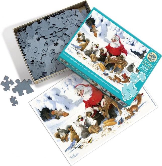 Enjoy assembling together with the family puzzle by COBBLE HILL featuring Santa and his animal friends. The box includes pieces in three sizes—small, medium, and large—making it ideal for kids, parents, and grandparents. The non-standard die-cut with unique piece shapes adds a fun challenge, and the finished image measures approx. 67.6 × 48.9 cm.