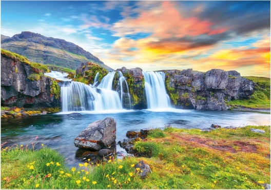 Vivid landscape with a waterfall and a colorful sky delights nature lovers and adds a sense of adventure to your puzzling.
