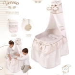 An elegant mobile doll crib from the VERONA collection brings a gentle natural design, canopy with little bows, a comfortable duvet, and 4 swivel wheels for easy maneuvering. Precise workmanship, light handling, and safe materials will delight every little caregiver.