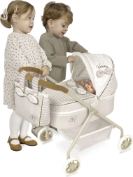 Discover a charming doll stroller in a soft combination of beige and white with polka dots and stripes. Quality craftsmanship and Spanish design ensure long-lasting use, while the low handle and low weight make it easy to maneuver even for the youngest children. The style is completed by decorative bows and delicate embroidery.