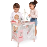 The set includes everything for complete care: a crib with a transparent mesh window, a leaf-themed mobile, a changing table, a high chair with a plastic set (bottle, bowl, cutlery), and a large zip-up wardrobe with a rod and 3 hangers. Thanks to its compact design, the whole setup is easy to handle and quick to put away after play.