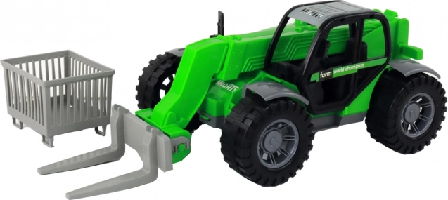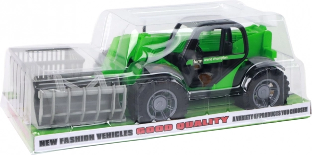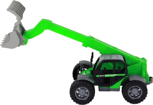 Robust green children's tractor with an extendable arm and three interchangeable attachments offers realistic play indoors and outdoors. Thanks to the friction drive, large wheels, and a transparent cab, it develops motor skills and imagination. Includes forks, a basket, and a log grab for various types of loading and transport.