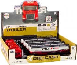 This detailed tanker set in 1:24 scale faithfully imitates a real truck. Pressing the cab activates realistic sounds (engine start, reversing) and light effects that enhance the play experience. The detachable trailer expands the play options – children can drive just the tractor unit or the whole rig.