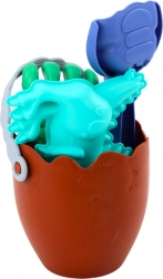 Dinosaur sand set with egg-shaped bucket, shovel, rake, and molds