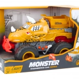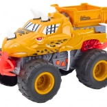 The toy car is designed like a dinosaur with teeth and horns, capturing every child’s attention.