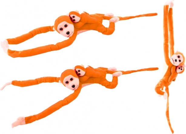 The plush monkey with orange fur is designed to be a soft and comforting companion for children.