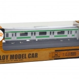 An elegant 1:48 scale metal collectible model of a train car. It offers realistic details, durable construction and a silver finish with green accents. Ideal for collectors and children aged 3+, meets CE and EN71 standards.