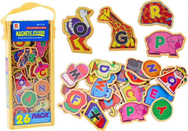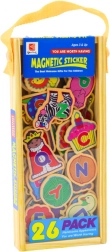 The set includes 26 magnets in vibrant colors that help children recognize alphabet letters through pictures of animals and objects.