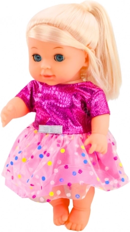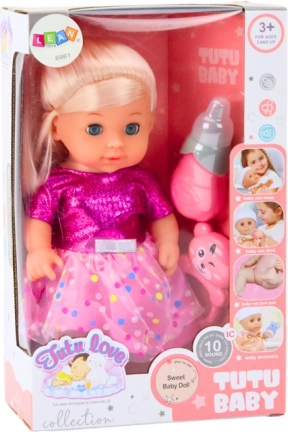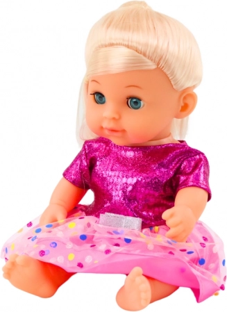 Doll in a pink polka-dot dress with bottle and rattle, with sounds and pee function