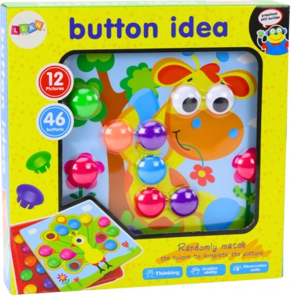 Children's puzzle with colorful buttons is not just fun, but also a great aid for learning. It helps recognize colors, develop logical thinking and contributes to the development of fine motor skills and hand-eye coordination. The buttons are easy to grasp and fit precisely into the holes on the images, making the game simple and fun.