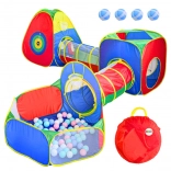 The triangular tent has a shooting target with hook-and-loop balls included in the set. The square tent has two entrances and connects the tents with tunnels, allowing children to move freely from one tent to another. The ball pool features a throwing hoop.
