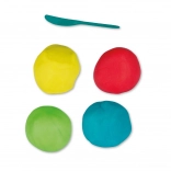 The image shows four colorful play dough balls - yellow, red, green, and turquoise. A creative toy for modeling and shaping into different forms.