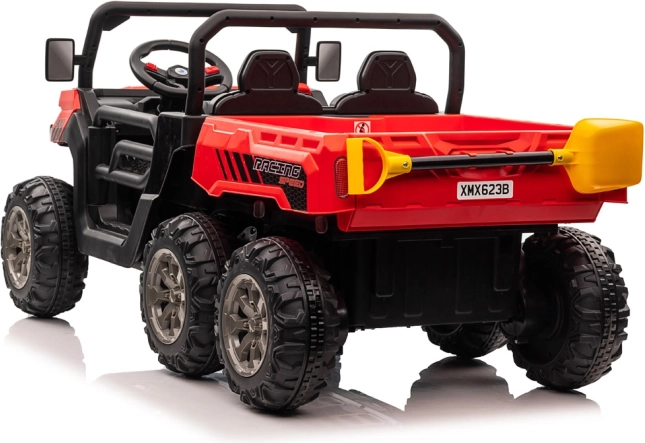 A robust kids’ electric car with 4x6 drive, two seats, and an electric tipping bed for little helpers. It offers 4 powerful 24V/75W motors, soft EVA wheels, smooth start, spring suspension, LED lighting, and a 2.4 GHz parent remote for safe driving in the yard and garden.