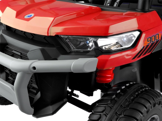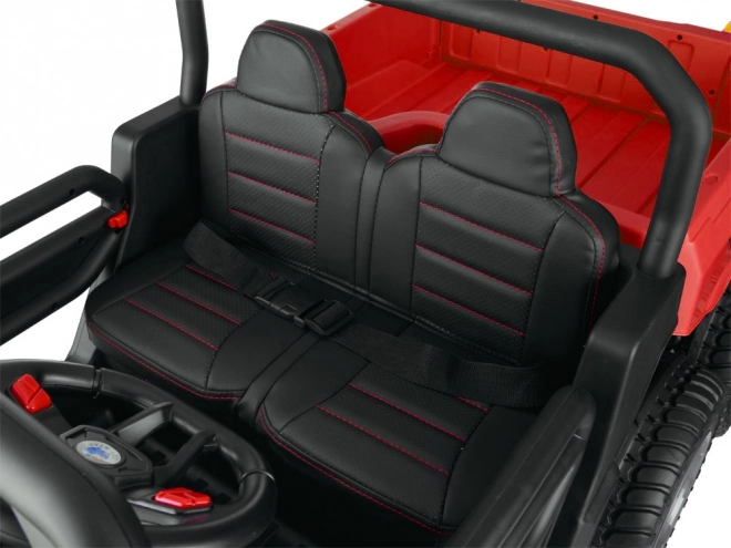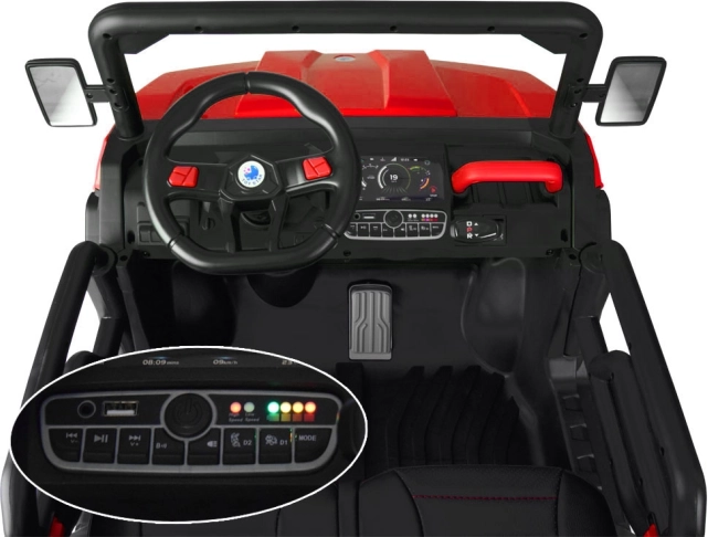 Little drivers will enjoy the realistic dashboard with direction selector (D/P/R), engine start sound, USB input, and music playback. Parents keep everything under control with the 2.4 GHz remote (forward/reverse, left/right, speed selection, and emergency stop). Opening doors with a latch make getting in easy, and safety belts add security.