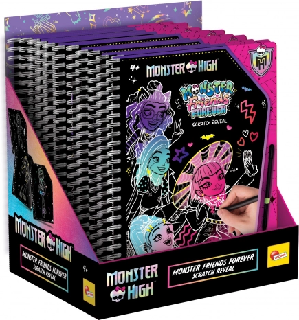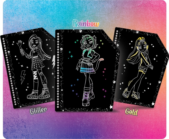 Discover the magical world of MONSTER HIGH with a scratch art sketchbook that reveals gold, glitter, and rainbow effects after removing the black layer. Perfect for creative fun at home or on the g... Show more