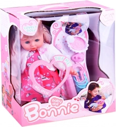 The set includes practical accessories: a bowl with porridge, spoon, pacifier, bottle, and rattle. Kids can feed, soothe, and put their baby to sleep.
